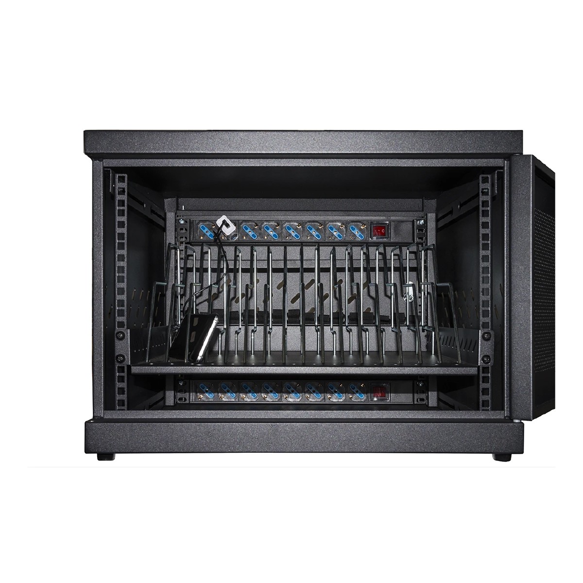 Armadio con chiusura a chiave che permette la protezione dei notebook e tablet custoditi all'interno. Con 2 multiprese da 8 porte con prese universali e spina 16A tripolare italiana. Le multiprese sono posizionate nella parte posteriore sui montanti 19"". Permettono l'inserimento dei caricatori dei notebook, tablet o smartphone.