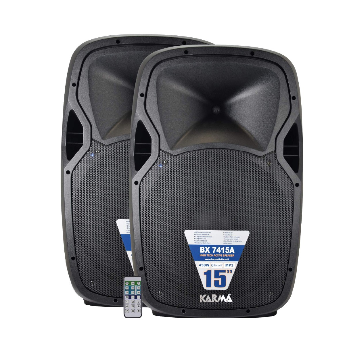 Kit di potenti casse per una potenza totale di 1000w da utilizzare in ambienti di grandi dimensioni o con attività all'aperto. Incluse due casse, una attiva da 450W e una passiva da 550W per un totale di 1000W.