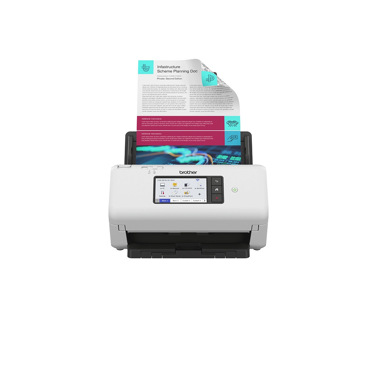 Brother ADS-4700W. Massima dimensione di scansione: 355,6 x 215,9 mm, Risoluzione di scansione ottica: 600 x 600 DPI, Risoluzione di scansione migliorata: 1200 x 1200 DPI. Tipo di scansione: Scanner con ADF + alimentatore di fogli, Colore del prodotto: Nero, Bianco, Tipologia display: LCD. Tipo sensore: Dual CIS, Ciclo di funzionamento quotidiano (max): 6000 pagine, Formati file scanner: JPEG, PDF, TIFF. Capacità documenti: 80 fogli. Massimo formato carta serie ISO A: A4, Scanning media types supported: Biglietto da visita, Carta normale, Scheda plastica, Carta riciclata, Carta spessa, Carta sottile, spessore dei materiali (min): 0,08 mm
