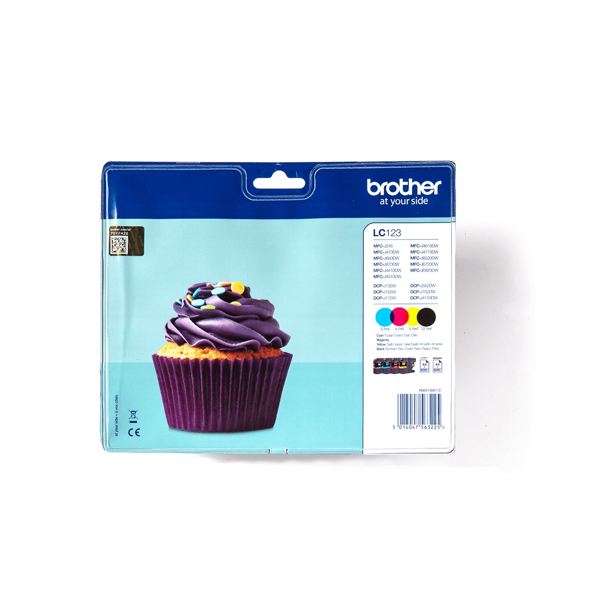 Brother LC-123VALBP. Tipo di fornitura: Confezione multipla, Resa in pagine dell'inchiostro a colori: 600 pagine, Colori di stampa: Nero, Ciano, Magenta, Giallo, Quantità per pacco: 4 pz, Resa in pagine dell'inchiostro a colori: 600 pagine