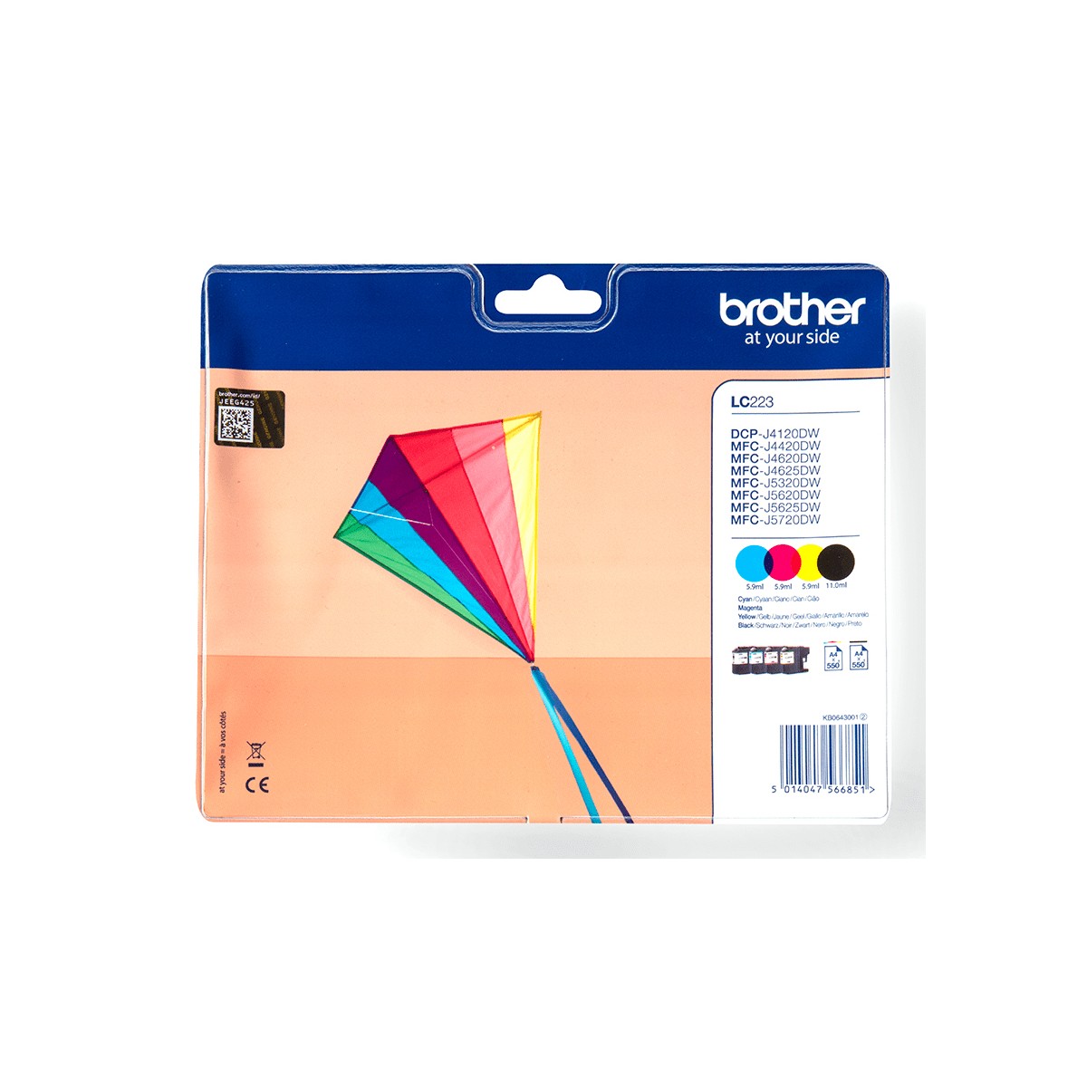 Brother LC-223VALBP. Tipo di fornitura: Confezione multipla, Resa in pagine dell'inchiostro a colori: 550 pagine, Colori di stampa: Nero, Ciano, Magenta, Giallo, Quantità per pacco: 4 pz, Resa in pagine dell'inchiostro a colori: 550 pagine