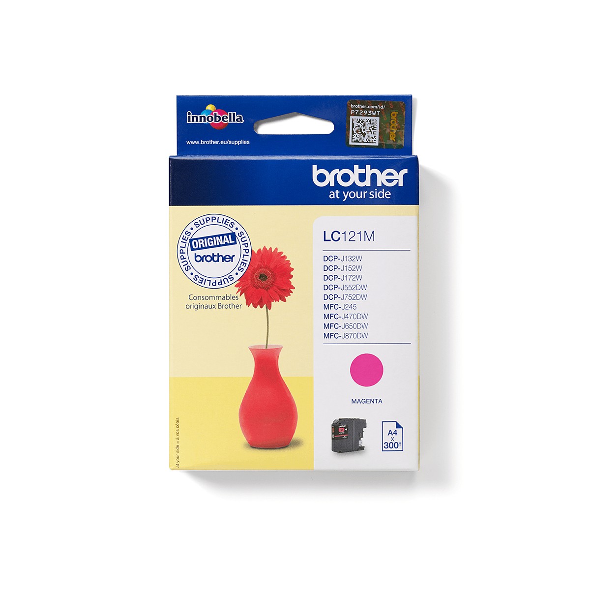 Brother LC121M. Tipo di inchiostro a colori: Inchiostro a base di pigmento, Tipo di fornitura: Confezione singola, Resa in pagine dell'inchiostro a colori: 300 pagine, Colori di stampa: Magenta, Quantità per pacco: 1 pz