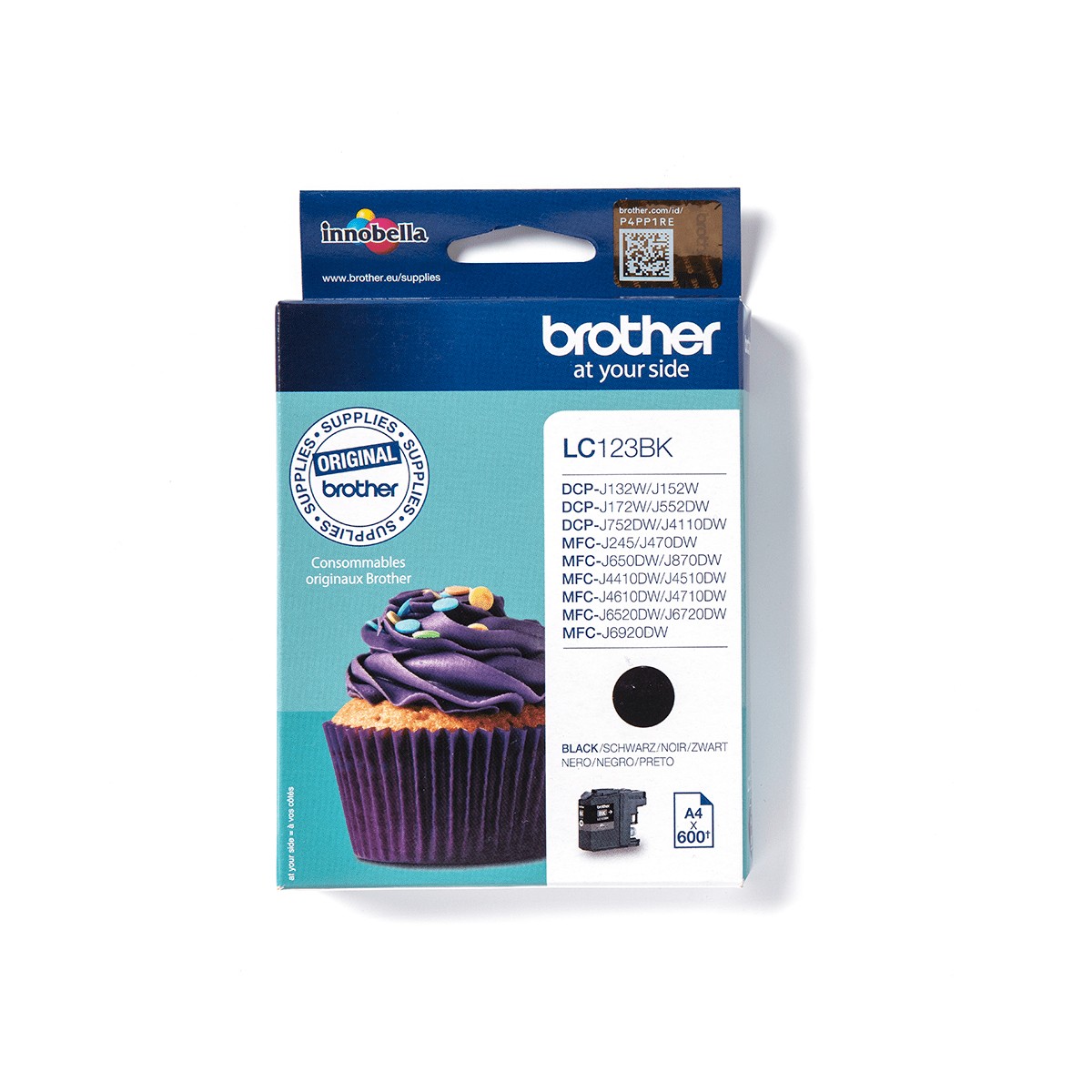 Brother LC123BK. Tipo di inchiostro nero: Inchiostro a base di pigmento, Tipo di fornitura: Confezione singola, Colori di stampa: Nero, Quantità per pacco: 1 pz, Resa in pagine dell'inchiostro a colori: 600 pagine