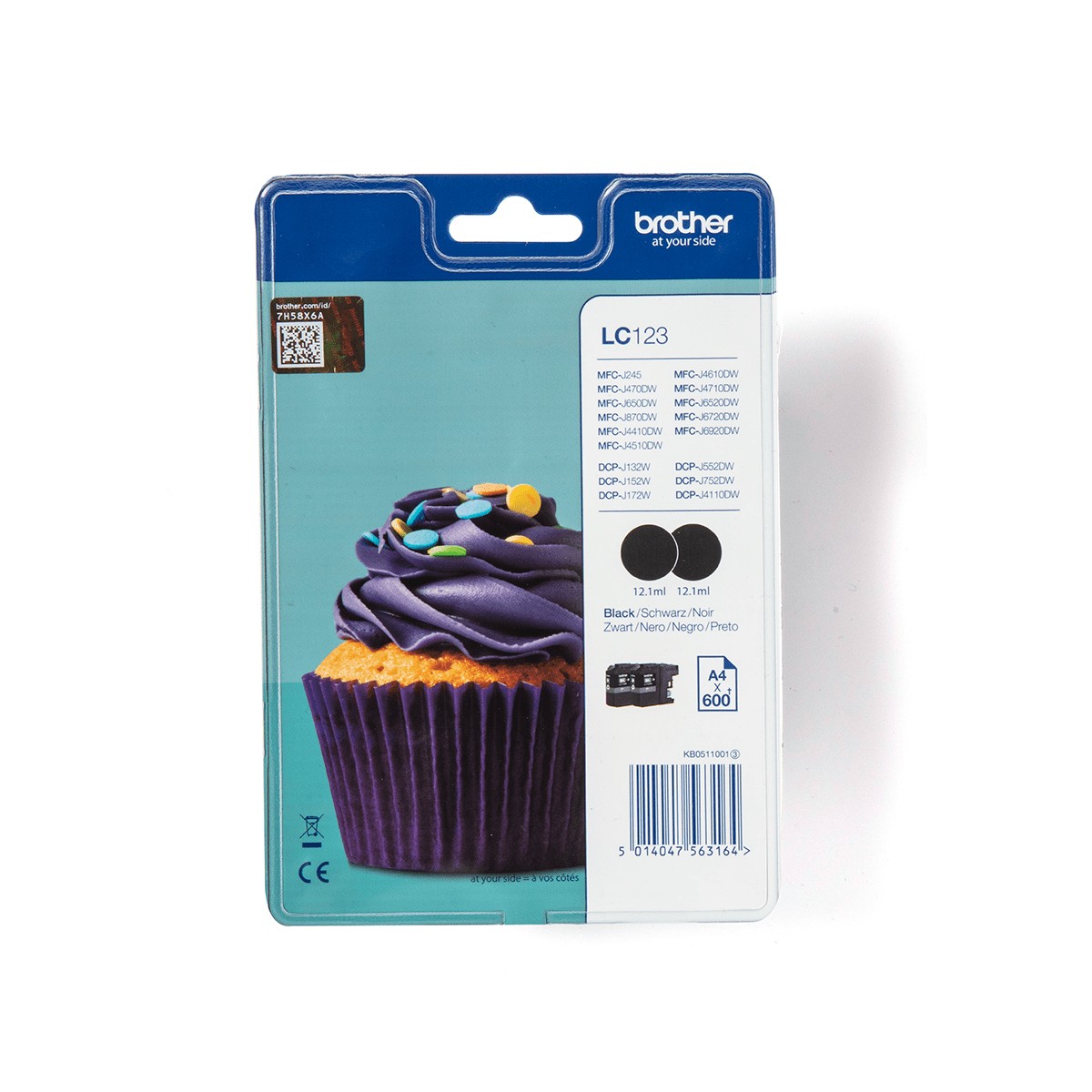 Brother LC123BKBP. Tipo di inchiostro nero: Inchiostro a base di pigmento, Tipo di fornitura: Confezione singola, Colori di stampa: Nero, Quantità per pacco: 1 pz, Resa in pagine dell'inchiostro a colori: 600 pagine