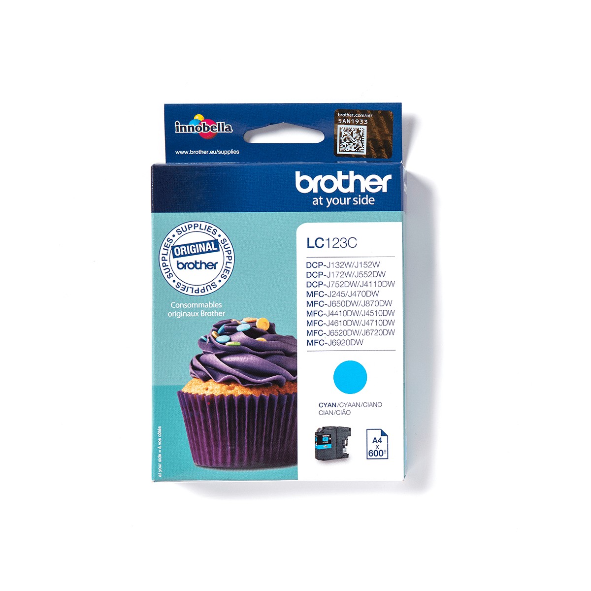 Brother LC123C. Tipo di fornitura: Confezione singola, Resa in pagine dell'inchiostro a colori: 600 pagine, Colori di stampa: Ciano, Quantità per pacco: 1 pz