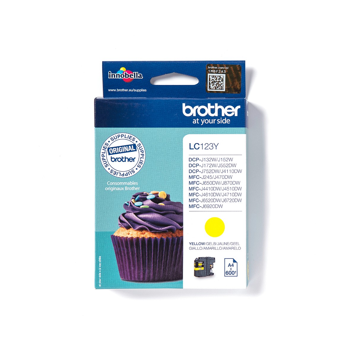 Brother LC123Y. Tipo di fornitura: Confezione singola, Resa in pagine dell'inchiostro a colori: 600 pagine, Colori di stampa: Giallo, Quantità per pacco: 1 pz