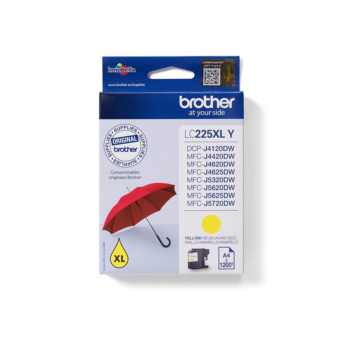 Brother LC225XLY. Tipo di inchiostro a colori: Inchiostro a base di pigmento, Tipo di cartuccia: Resa elevata (XL), Tipo di fornitura: Confezione singola, Resa in pagine dell'inchiostro a colori: 1200 pagine, Colori di stampa: Giallo, Quantità per pacco: 1 pz