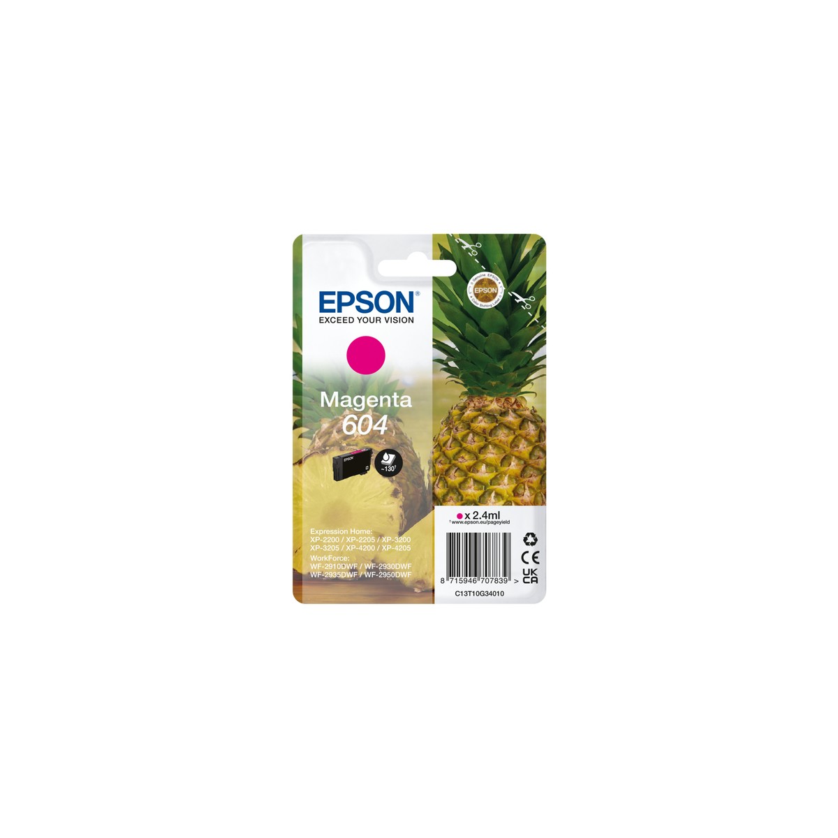 Epson 604. Tipo di cartuccia: Resa standard, Tipo di fornitura: Confezione singola, Resa in pagine dell'inchiostro a colori: 604 pagine, Volume dell'inchiostro a colori: 2,4 ml, Colori di stampa: Magenta, Quantità per pacco: 1 pz
