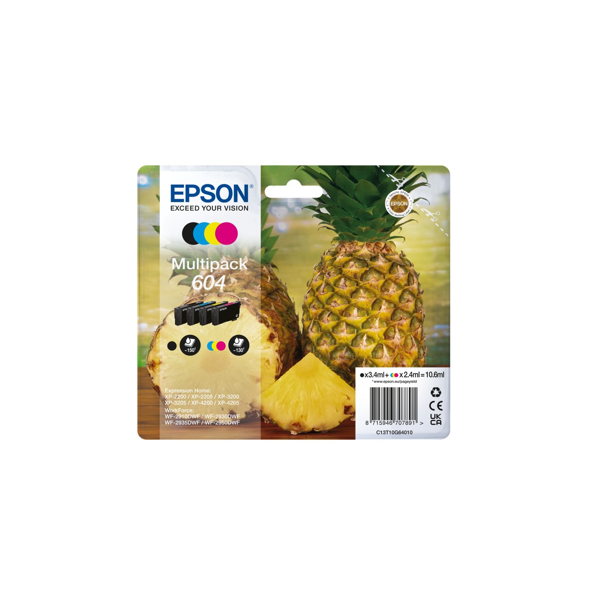 Epson 604. Tipo di cartuccia: Resa standard, Volume dell'inchiostro nero: 3,4 ml, Tipo di fornitura: Confezione multipla, Resa in pagine dell'inchiostro a colori: 130 pagine, Volume dell'inchiostro a colori: 2,4 ml, Colori di stampa: Nero, Ciano, Magenta, Giallo, Quantità per pacco: 4 pz, Resa in pagine dell'inchiostro a colori: 150 pagine