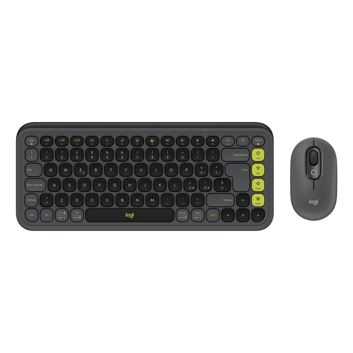 Logitech POP Icon Combo tastiera + Mouse Bluetooth (Grafite, Verde). Fattore di forma tastiera: Mini. Stile tastiera: Dritto. Tecnologia di connessione: Wireless, Interfaccia dispositivo: Bluetooth, Interruttore a chiave per tastiera: Tasto con meccanismo a forbici, Struttura tastiera: QWERTY, Utilizzo raccomandato: Universale. Colore del prodotto: Grafite. Mouse incluso