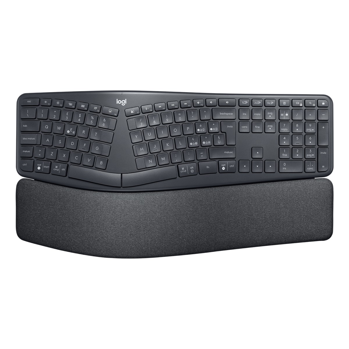 Logitech ERGO K860 for Business - Tastiera split ergonomica - Design ergonomico, tecnologia Logi Bolt sicura, Bluetooth, certificazione globale, Windows/Mac/Chrome/Linux - Graphite. Fattore di forma tastiera: Full-size (100%). Stile tastiera: Curvo. Tecnologia di connessione: Wireless, Interfaccia dispositivo: Bluetooth, Interruttore a chiave per tastiera: Interruttore a chiave semimeccanico, Struttura tastiera: QWERTY. Riposo del polso. Utilizzo raccomandato: Ufficio. Colore del prodotto: Grafite